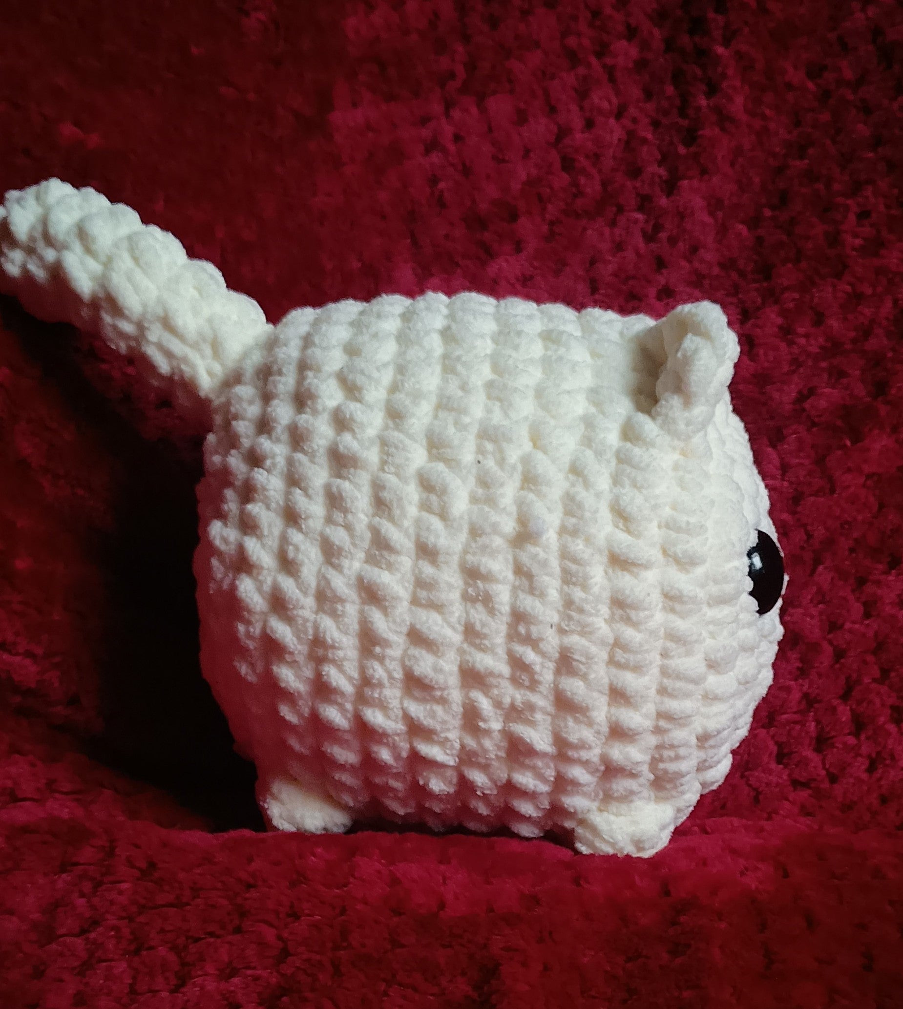 Handmade crochet loaf cat plushie made from jumbo blanket yarn. Body is pproximately 5" wide by 6" width By 5" tall.